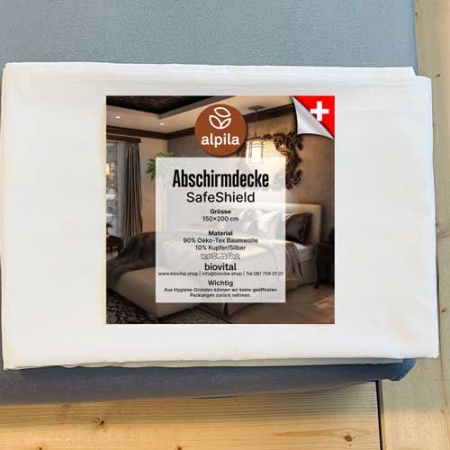 Produktbezeichnung Strahlenschutz-Decke SafeShield Comfort Grösse ca. 140 x 200 cm Material 100 % Baumwolle mit eingewebtem Silberfaden Pflegehinweis Schonwäsche bei 30 °C, nicht tumblergeeignet Abschirmleistung Bis zu 99,9 % bei 1–5 GHz (laborgeprüft) Herkunft / Partner Swiss Shield® – EMF-Schutztextilien aus der Schweiz Hersteller / Material