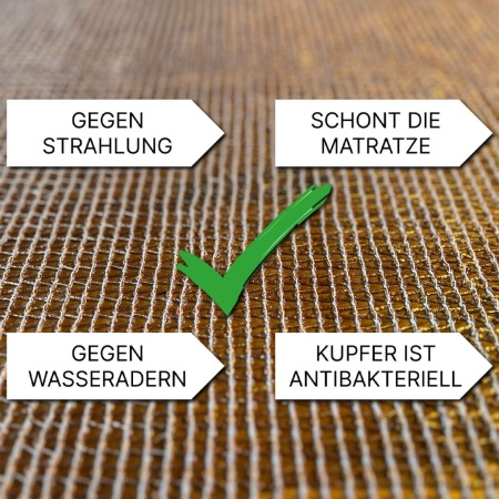 Unsere Kupfermatte wirkt wie ein natürlicher Schutzschild gegen schädliche Strahlungen wie Elektrosmog und Erdstrahlen. Das fein gewebte Kupfergewebe funktioniert nach dem bewährten Prinzip des Faradayschen Käfigs, das Strahlungen effektiv ableitet und deinem Hund so einen stressfreien Rückzugsort bietet.